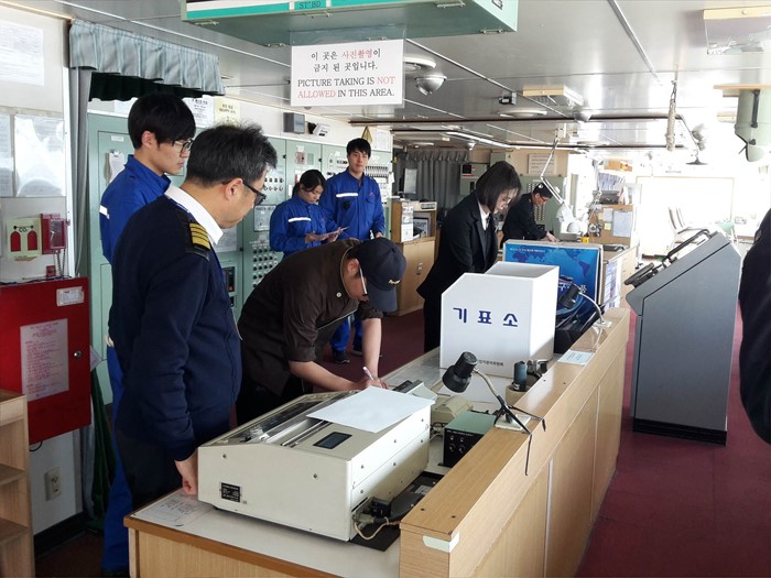 (서울=포커스뉴스) 지난 5일 부산과 일본을 오가는 팬스타 드림호에서 선원들이 선상투표를 하고 있다. <사진제공=부산시 선거관리위원회>