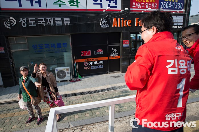 (서울=포커스뉴스) 김용태 새누리당 양천구을 후보가 7일 오후 서울 양천구 신월동 일대에서 선거운동을 하고 있다.