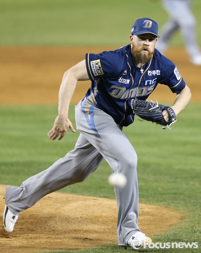 (서울=포커스뉴스) 7일 서울 잠실구장에서 열린 2016 프로야구 NC-두산 경기 4회말 2사 1,3루에서 두산 정수빈의 1루땅볼을 NC 투수 해커가 잡으로 달려가고 있다.