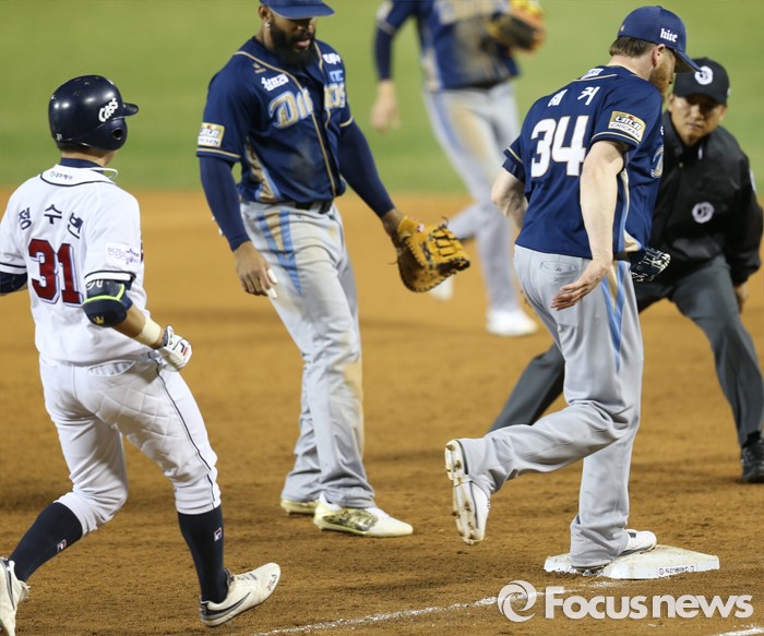 (서울=포커스뉴스) 7일 서울 잠실구장에서 열린 2016 프로야구 NC-두산 경기 4회말 2사 1,3루에서 두산 정수빈의 1루땅볼을 NC 투수 해커가 잡아 1루 베이스를 밟고 있다.