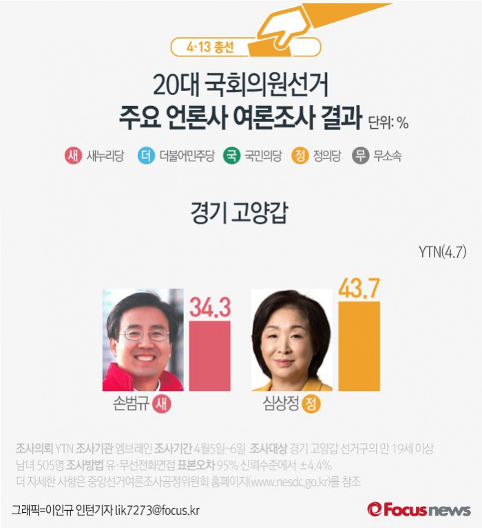 YTN이 여론조사기관 엠브레인에 의뢰해 7일 발표한 결과에 따르면 경기 고양갑 선거구 후보 지지도는 심상정 후보가 43.7%로 손범규 후보(34.3%)보다 9.4%p 높았다.