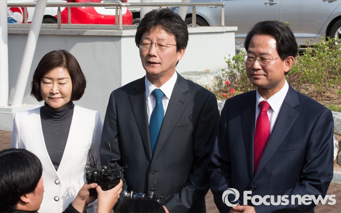 (대구=포커스뉴스) 무소속 유승민(가운데), 권은희(왼쪽), 류성걸 후보가 8일 오전 대구 북구 산격3동 주민센터에 마련된 사전투표소에서 사전투표를 마치고 기자회견을 하고 있다.