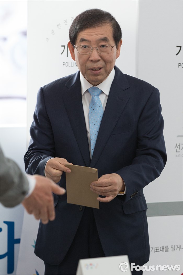 (서울=포커스뉴스) 4.13총선을 닷새 앞둔 8일 오전 서울 용산구 서울역에 설치된 남영동 사전투표소에서박원순 서울시장이 투표를 하고 있다.