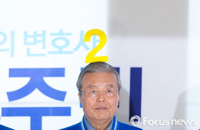 (서울=포커스뉴스) 김종인 더불어민주당 비대위 대표 겸 선대위원장이 8일 오전 서울 은평구 응암로 박주민 은평구갑 후보 사무실에서 중앙선거대책위원회 회의 전 2번 머리띠를 착용하고 지역 어르신들과 기초노령연금인상 공약 퍼포먼스를 하고 있다.