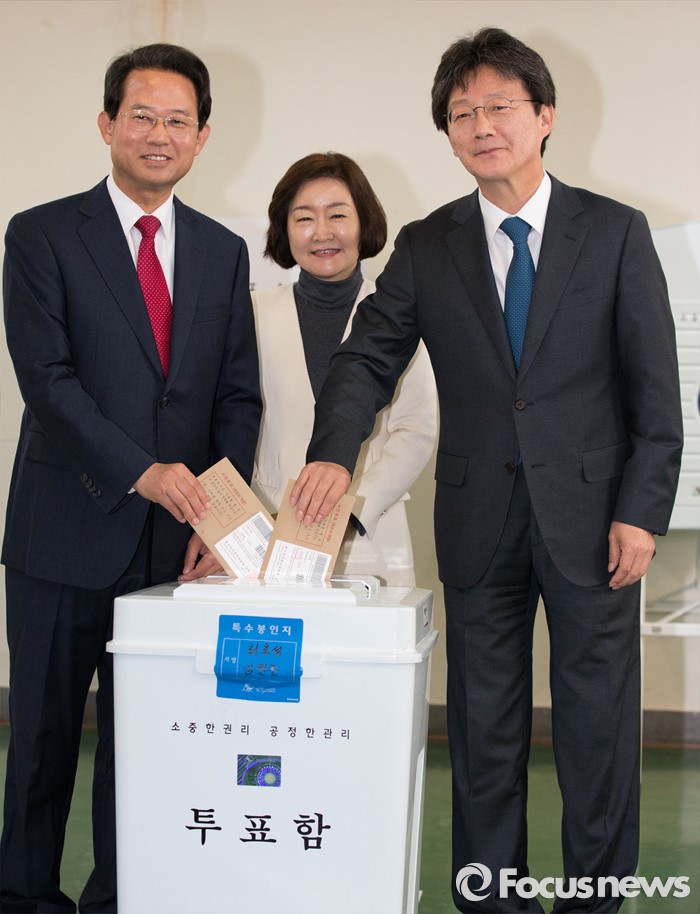 (대구=포커스뉴스) 무소속 유승민(대구 동을, 오른쪽부터), 권은희(대구 북갑), 류성걸(대구 동갑) 후보가 8일 오전 대구 북구 산격3동 주민센터에 마련된 사전투표소에서 사전투표를 하고 있다.