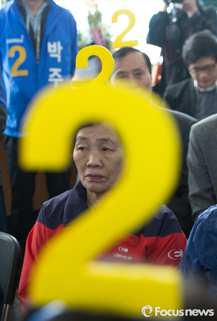(서울=포커스뉴스) 8일 오전 서울 은평구 응암로 박주민 은평구갑 후보 사무실에서 열린 중앙선거대책위원회 회의에 참석한 지역 어르신들이 2번 머리띠를 착용하고 있다.