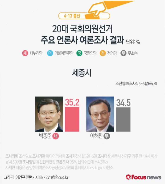 (서울=포커스뉴스) 조선일보가 여론조사기관 미디어리서치에 의뢰해 8일 발표한 결과에 따르면 세종시에서 새누리당 박종준 후보의 지지율은 35.2%, 무소속 이해찬 후보의 지지율은 34.5%인 것으로 나타났다.