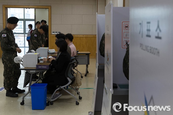 (고양=포커스뉴스) 20대 총선 사전투표가 시작된 8일 오전 고양시 일산동구 식사동 주민센터에 마련된 사전투표소에서 군인장병들이 투표하고 있다.