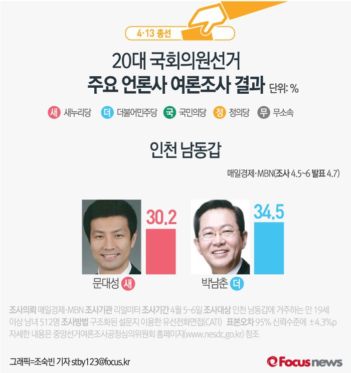 (서울=포커스뉴스) 매일경제와 MBN이 여론조사기관 리얼미터에 의뢰해 7일 발표한 결과에 따르면 인천 남동갑에서 새누리당 문대성 후보의 지지율은 30.2%, 더불어민주당 박남춘 후보의 지지율은 34.5%인 것으로 나타났다.