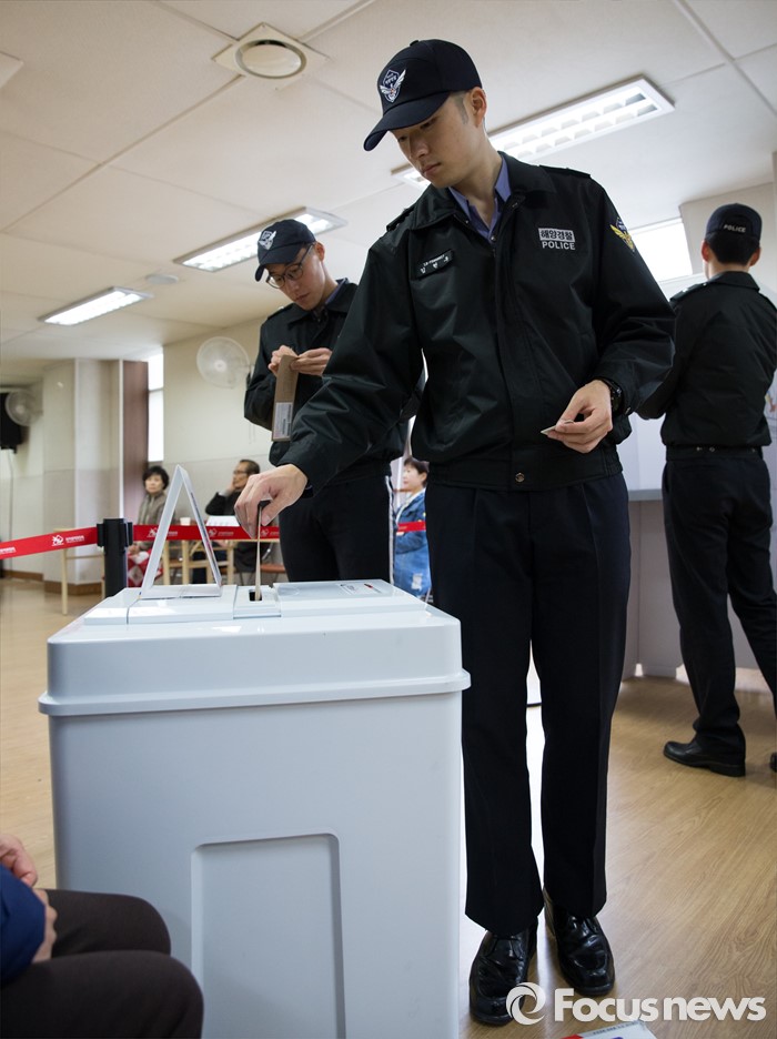 (인천=포커스뉴스) 제20대 국회의원 선거 사전투표 시작일인 8일 오전 인천 연수구 송도1동 주민센터에서 인천 중부해양경비안전본부 소속 해경들이 사전투표를 하고 있다.