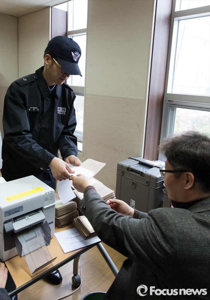 (인천=포커스뉴스) 제20대 국회의원 선거 사전투표 시작일인 8일 오전 인천 연수구 송도1동 주민센터에서 인천 중부해양경비안전본부 소속 해경이 신원확인을 하고 있다.