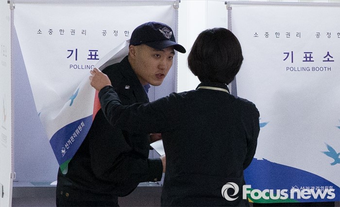(인천=포커스뉴스) 제20대 국회의원 선거 사전투표 시작일인 8일 오전 인천 연수구 송도1동 주민센터에서 인천 중부해양경비안전본부 소속 해경이 사전투표를 하고 있다.