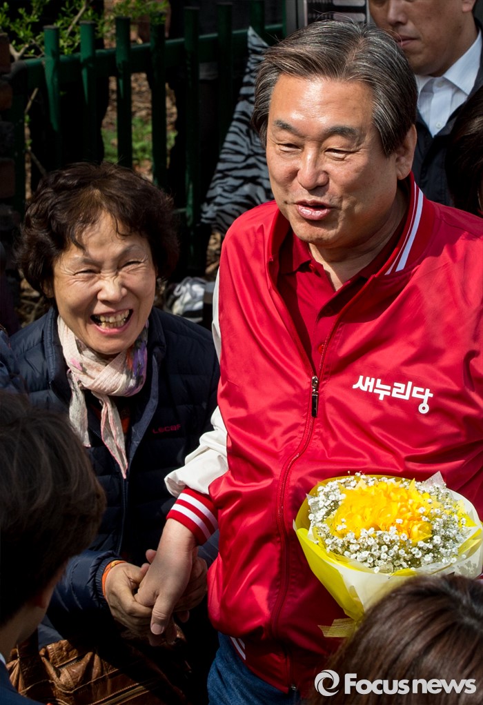 (안양=포커스뉴스) 8일 오전 경기 안양시 범계역 인근에서 심재철 새누리당 안양동을 후보 지원유세에 나선 김무성 대표가 한 지지자에게 꽃다발을 받고 있다.