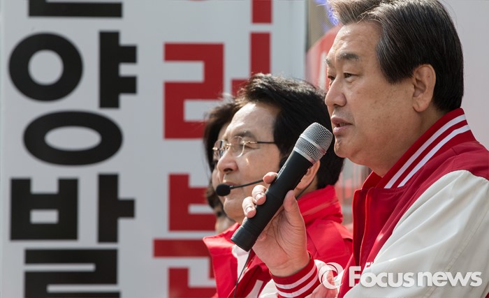 (안양=포커스뉴스) 8일 오전 경기 안양시 범계역 인근에서 심재철 새누리당 안양동을 후보 지원유세에 나선 김무성 대표가 유권자들의 지지를 호소하고 있다.