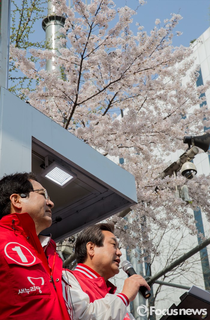 (안양=포커스뉴스) 8일 오전 경기 안양시 범계역 인근에서 심재철 새누리당 안양동을 후보 지원유세에 나선 김무성 대표가 유권자들의 지지를 호소하고 있다.