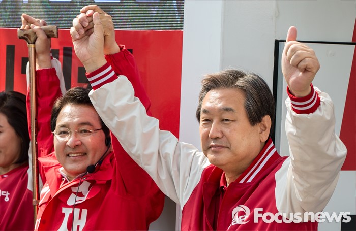 (안양=포커스뉴스) 8일 오전 경기 안양시 범계역 인근에서 심재철 새누리당 안양동을 후보 지원유세에 나선 김무성 대표가 유권자들의 지지를 호소하고 있다.