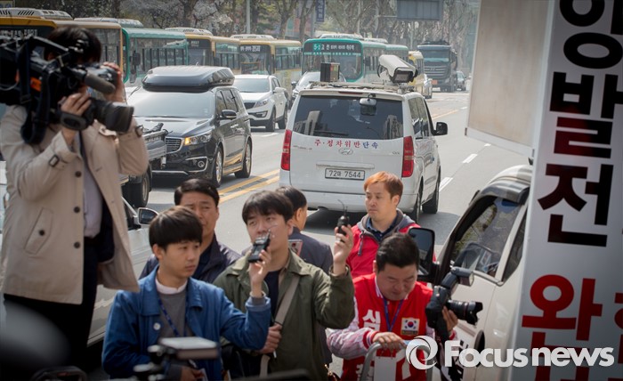 (안양=포커스뉴스) 8일 오전 경기 안양시 범계역 인근에서 열린 심재철 새누리당 안양동을 후보 지원유세현장 옆을 주차단속차량이 지나가고 있다.