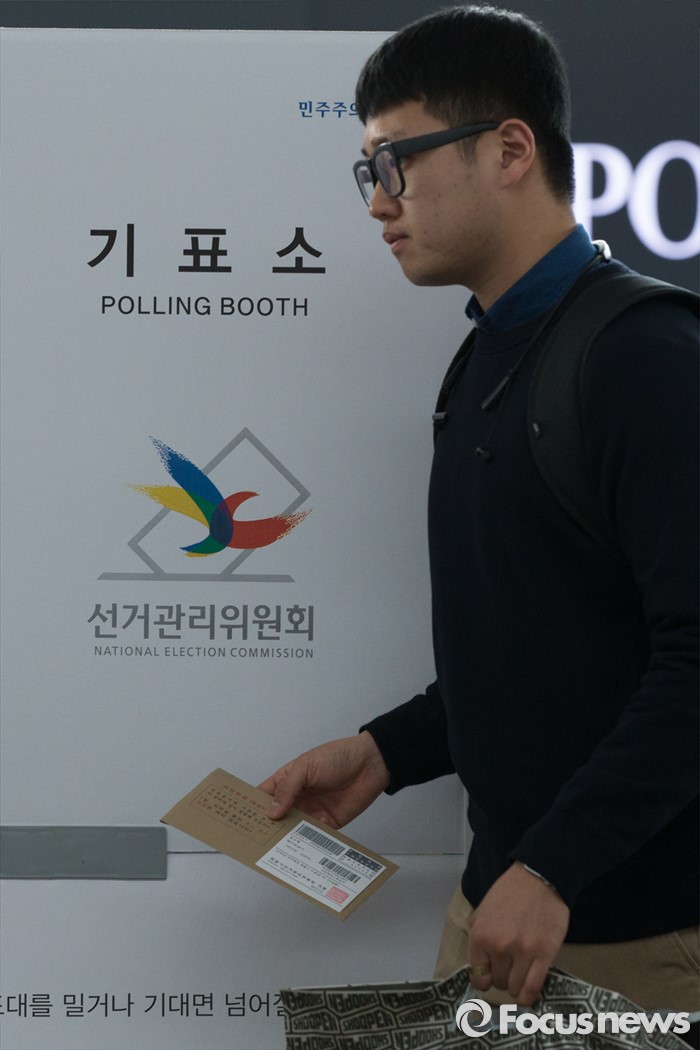 (서울=포커스뉴스) 4.13총선 사전투표 첫째날인 8일 오전 서울 용산구 서울역에 설치된 남영동 사전투표소에서 시민들이 투표를 하고 있다. 사전투표는 4.8~4.9일까지 진행된다.