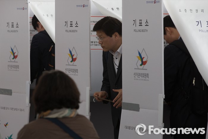 (서울=포커스뉴스) 4.13총선 사전투표 첫째날인 8일 오전 서울 용산구 서울역에 설치된 남영동 사전투표소에서 시민들이 투표를 하고 있다. 사전투표는 4.8~4.9일까지 진행된다.
