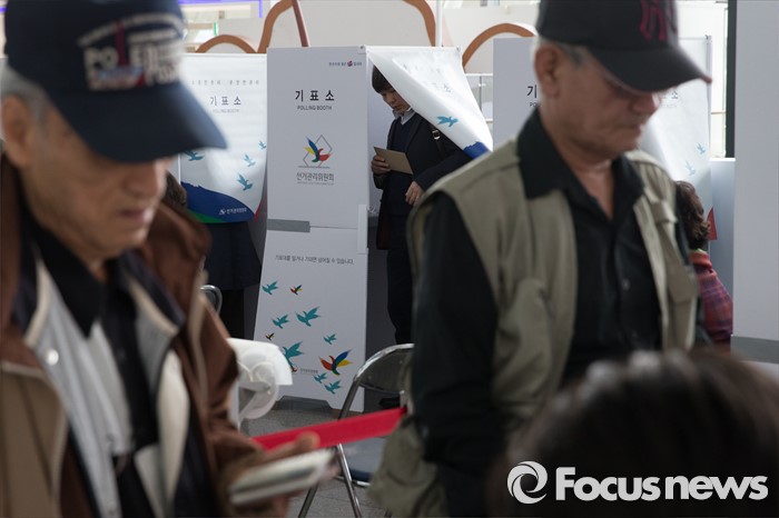 (서울=포커스뉴스) 4.13총선 사전투표 첫째날인 8일 오전 서울 용산구 서울역에 설치된 남영동 사전투표소에서 시민들이 투표를 하고 있다. 사전투표는 4.8~4.9일까지 진행된다.