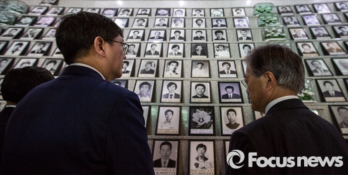 (광주=포커스뉴스) 문재인 더불어민주당 전 대표와 김홍걸 국민통합위원장이 8일 오전 전남 광주 5.18 민주묘지 내 유영봉안소를 방문 하고 있다.
