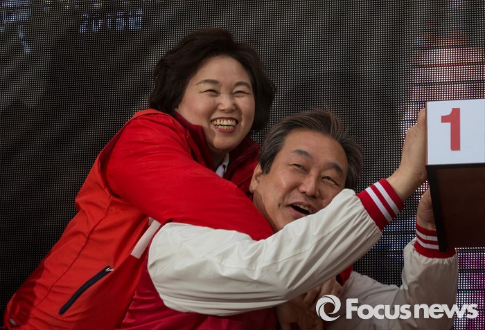 (부천=포커스뉴스) 8일 오전 경기 부천시 역곡역 인근에서 차명진 새누리당 부천소사구 후보 지원유세에서 나선 김무성 대표가 이음재 부천원미갑 후보를 업어주고 있다.
