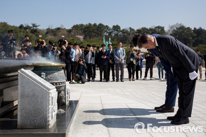 (광주=포커스뉴스) 문재인 더불어민주당 전 대표와 김홍걸 국민통합위원장이 8일 오전 전남 광주 5.18 민주항쟁 추모탑을 찾아 참배 하고 있다.