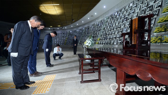 (광주=포커스뉴스) 8일 오전 광주 국립 518묘지를 찾은 더불어민주당 문재인(왼쪽) 전 대표와 김홍걸 국민통합위원장이 유영봉안소에서 묵념을 하고 있다.