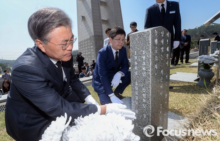 (광주=포커스뉴스) 8일 오전 광주 국립 518묘지를 찾은 더불어민주당 문재인(왼쪽) 전 대표와 김홍걸 국민통합위원장이 묘역을 참배하고 있다.