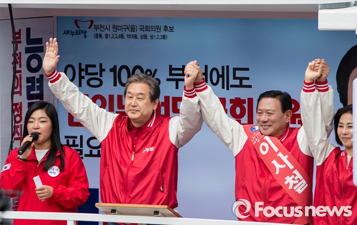(부천=포커스뉴스) 8일 오후 경기 부천시 역곡역 인근에서 이사철 새누리당 부천원미을 후보 지원유세에 나선 김무성 대표가 유권자들의 지지를 호소하고 있다.