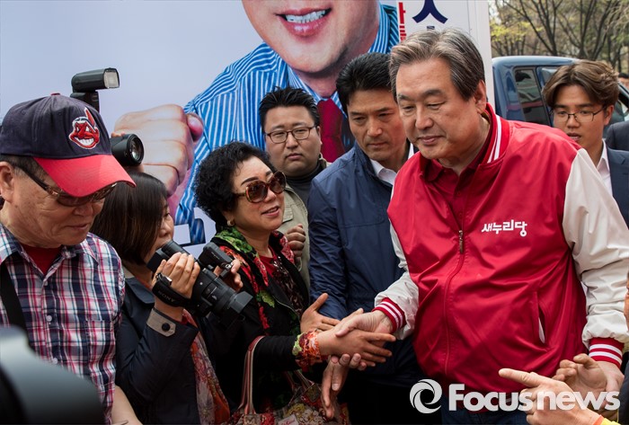 (부천=포커스뉴스) 8일 오후 경기 부천시 역곡역 인근에서 이사철 새누리당 부천원미을 후보 지원유세에 나선 김무성 대표가 지지자들과 악수하고 있다.