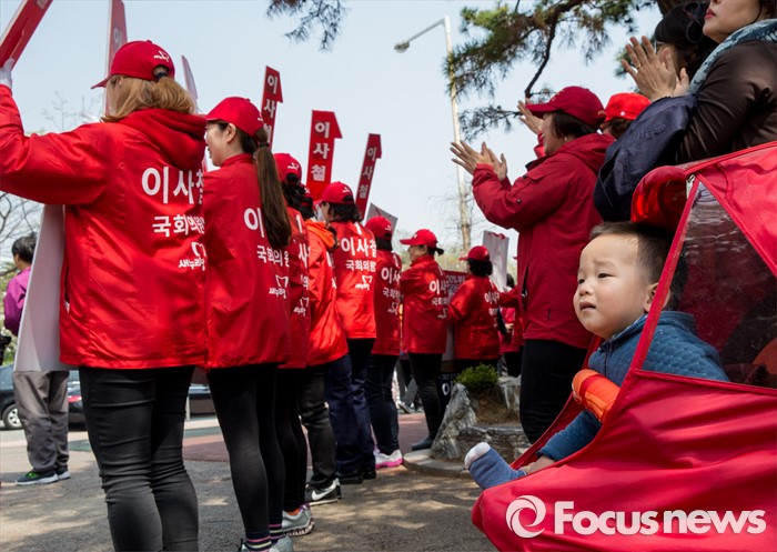(부천=포커스뉴스) 8일 오후 경기 부천시 역곡역 인근에서 열린 이사철 새누리당 부천원미을 후보 지원유세에서 유한 어린이가 선거사무원들을 신기한 듯 바라보고 있다.