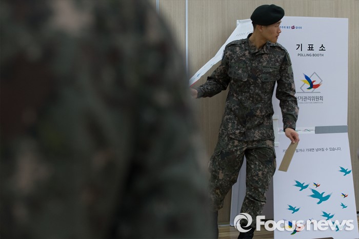 (서울=포커스뉴스) 4.13총선 사전투표 첫째날인 8일 오후 서울 서초구 방배4동 주민센터에 설치된 사전투표소에서 수방사 장병들이 투표를 하고 있다.
