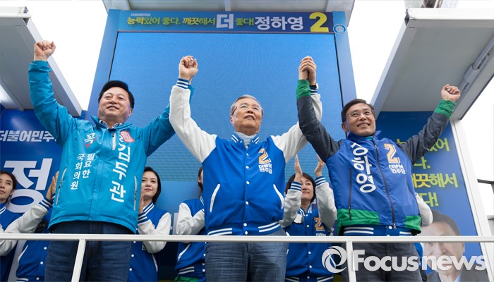 (김포=포커스뉴스) 김종인(가운데) 더불어민주당 비대위 대표 겸 선대위원장이 8일 오후 경기 김포 장기사거리에서 김두관(왼쪽) 김포시갑 후보와 정하영(오른쪽) 김포시을 후보 합동지원유세를 하고 있다.
