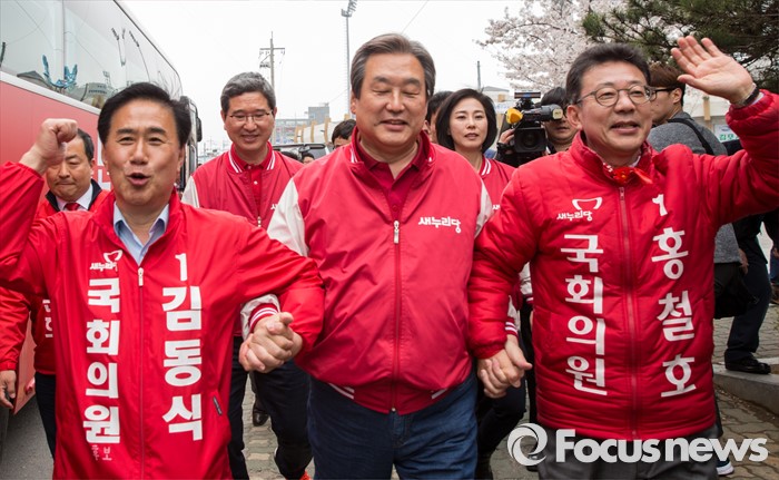 (김포=포커스뉴스) 8일 오후 경기 김포시 사우동 인근에서 김동식 새누리당 김포갑, 홍철호 김포을 후보 합동지원유세에 나선 김무성 대표가 유권자들의 지지를 호소하고 있다.