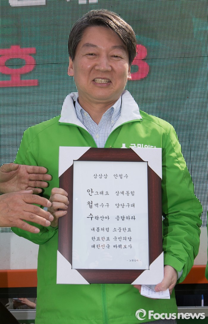 (천안=포커스뉴스) 안철수 국민의당 대표가 8일 오후 충남 천안 신부동 신세계백화점 앞에서 지원유세 중 시민으로부터 받은 선물을 보이고 있다.