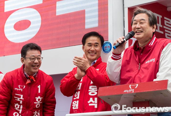 (김포=포커스뉴스) 8일 오후 경기 김포시 사우동 인근에서 김동식 새누리당 김포갑, 홍철호 김포을 후보 합동지원유세에 나선 김무성 대표가 유권자들의 지지를 호소하고 있다.