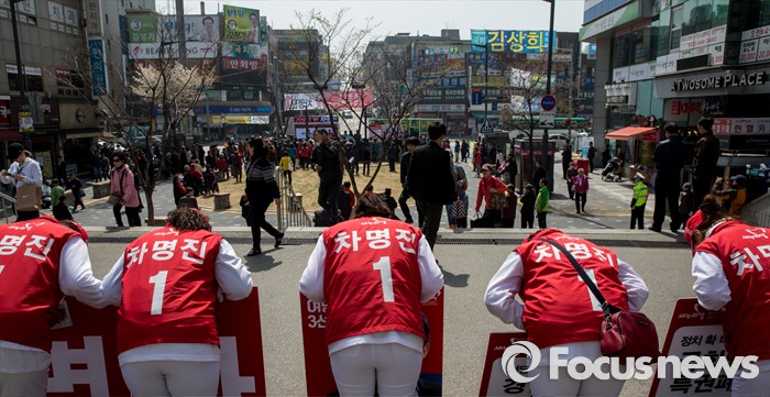 이어 "20대 국회에서는 국회선진화법 무력화시켜서 이제 야당 의원들 발목잡을때 우리 차명진 의원 앞장세워 몸싸움해서라도 이런 법 반드시 통과시키겠다"고 재차 말했다.(부천=포커스뉴스) 8일 오전 경기 부천시 역곡역 인근에서 열린 차명진 새누리당 부천소사구 후보 지원유세에서 차 후보의 선거사무원이 시민들에게 허리 숙여 인사하고 있다. 2016.04.08 양지웅 기자