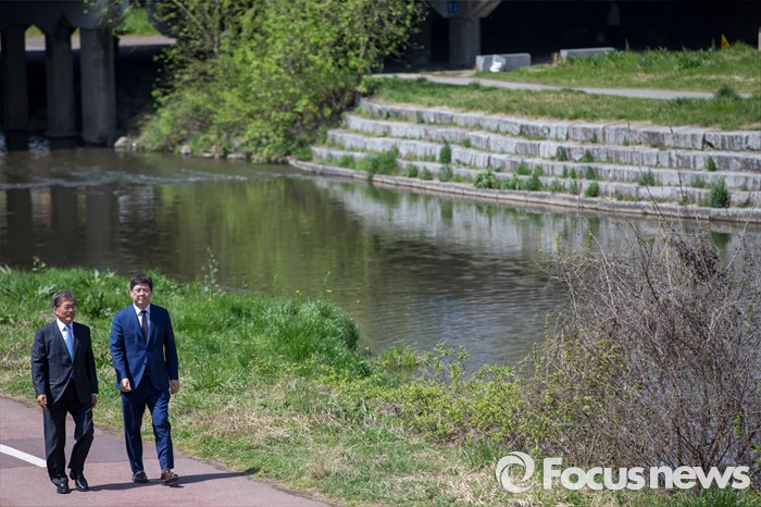 (광주=포커스뉴스) 문재인(왼쪽) 더불어민주당 전 대표와 김홍걸 국민통합위원장이 8일 오후 광주시 서구 광주천일대를 거닐며 대화를 나누고 있다.
