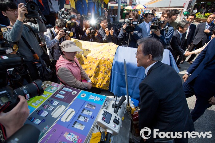 (광주=포커스뉴스) 문재인(오른쪽) 더불어민주당 전 대표가 8일 오후 전남 광주 양동전통시장을 방문해 상인과 대화를 나누고 있다.