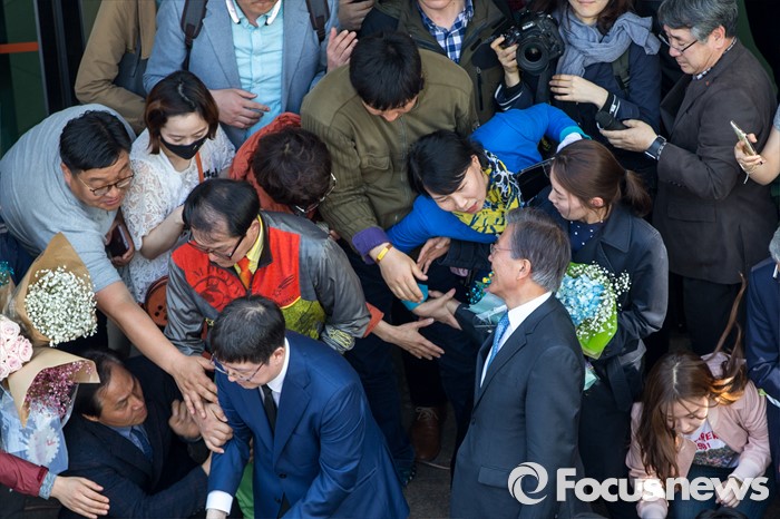 (광주=포커스뉴스) 문재인 더불어민주당 전 대표가 8일 오후 광주광역시 동구 충장로에서 기자회견을 열고 '광주시민께 드리는 글'을 발표한 뒤 지지자들과 악수 하고 있다. 이날 문 전 대표는 "호남이 자신에 대한 지지를 거두겠다면 미련없이 정치 일선에서 물러나고 대선에도 도전하지 않겠다고" 밝혔다.