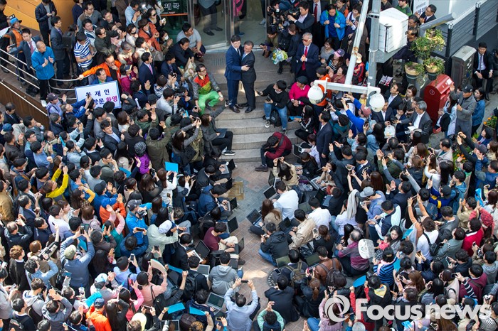 (광주=포커스뉴스) 김홍걸 국민통합위원장이 8일 오후 광주광역시 동구 충장로에서 시민들에게 "문재인 전 대표 아버지(故 김대중 전 대통령) 배신하지않았다"는 입장을 밝힌 뒤 문 전 대표와 포옹 하고 있다.