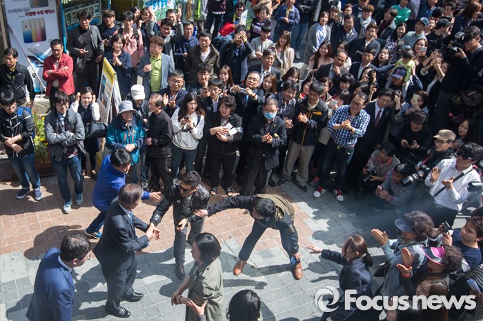 (광주=포커스뉴스) 문재인 더불어민주당 전 대표가 8일 오후 광주광역시 동구 충장로에서 기자회견을 열고 '광주시민께 드리는 글'을 발표하기 위해 연단으로 향하며 지지자들과 악수 하고 있다.