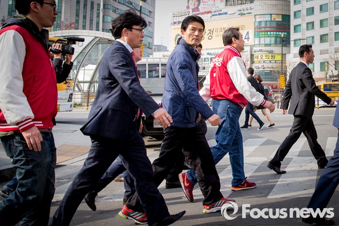 (고양=포커스뉴스) 8일 오후 경기 고양시 화정역 광장에서 손범규 새누리당 고양갑, 김태원 고양을 후보 합동지원유세를 마친 김무성(오른쪽 두 번째) 대표가 경호를 받으며 버스로 향하고 있다.