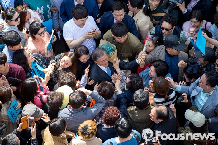 (광주=포커스뉴스) 문재인 더불어민주당 전 대표가 8일 오후 광주광역시 동구 충장로에서 기자회견을 열고 '광주시민께 드리는 글'을 발표한 뒤 지지자들과 악수 하고 있다. 이날 문 전 대표는 "호남이 자신에 대한 지지를 거두겠다면 미련없이 정치 일선에서 물러나고 대선에도 도전하지 않겠다고" 밝혔다.