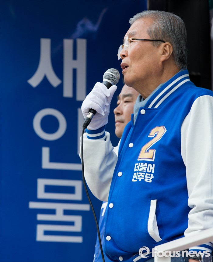 (파주=포커스뉴스) 김종인 더불어민주당 비대위 대표 겸 선대위원장이 8일 오후 경기 파주 금촌역 앞에서 윤후덕 파주시갑 후보와 박정 파주시을 후보 합동지원유세를 하고 있다.
