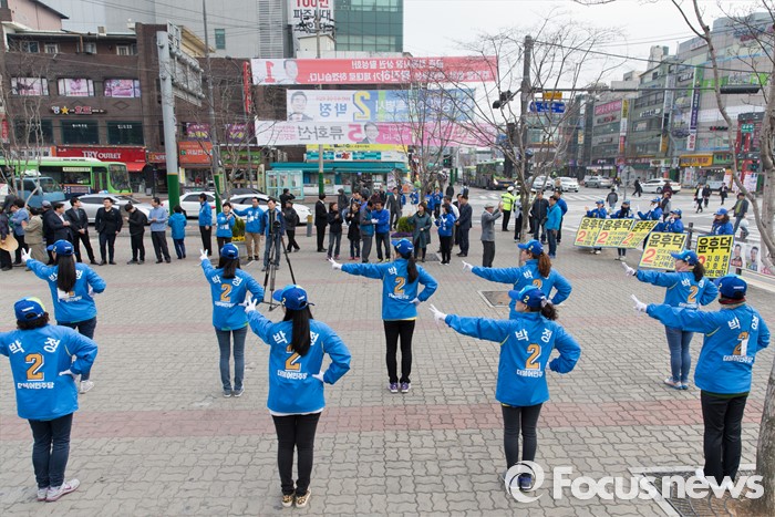 (파주=포커스뉴스) 김종인 더불어민주당 비대위 대표 겸 선대위원장이 8일 오후 경기 파주 금촌역 앞에서 박정 파주시을 후보 선거운동원들이 지지를 호소하고 있다.