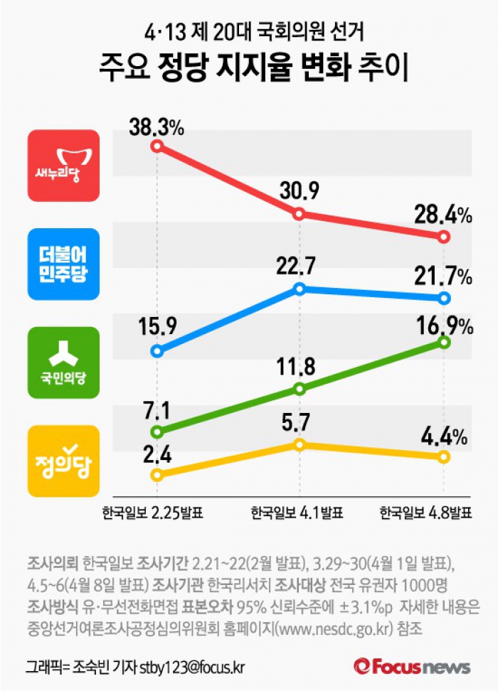 (서울=포커스뉴스) 한국일보가 여론조사기관 한국리서치에 의뢰해 5~6일 조사해 8일 발표한 결과에 따르면 새누리당 정당 지지율이 하락 추세를 보이는 것으로 나타났다.