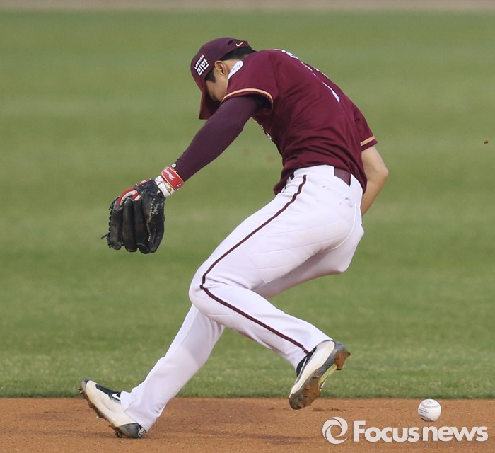 (서울=포커스뉴스) 8일 서울 잠실구장에서 열린 2016 프로야구 넥센-두산 경기 1회말 무사 1,2루에서 넥센 유격수 김하성이 두산 민병헌의 강습타구를 놓치고 있다.