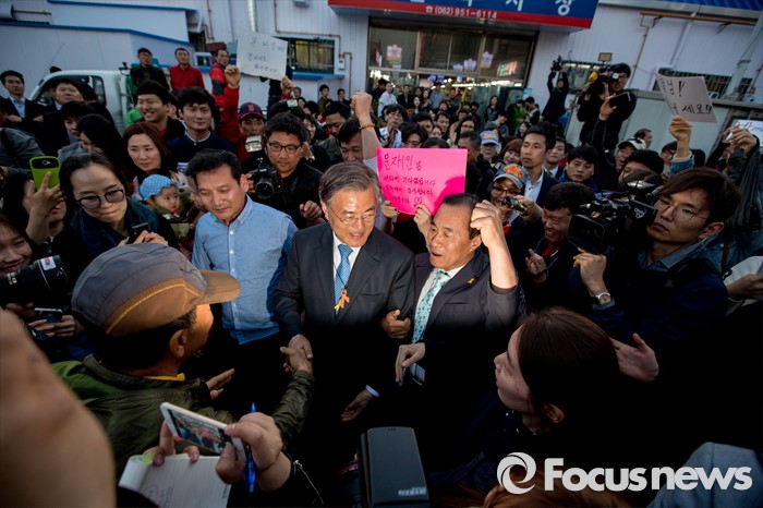 퐁광주=포커스뉴스) 문재인 더불어민주당 전 대표가 8일 오후 광주광역시 광산구 월곡시장을 방문해 시민들과 악수 하고 있다.